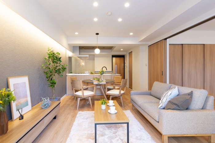 LDKは隣の洋室と、引き戸で間仕切りができるため、広いリビングとしても、独立した洋室としても、