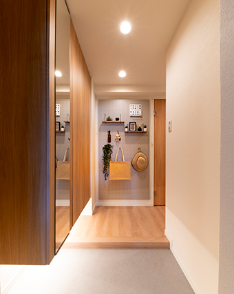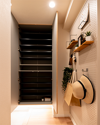 玄関入って左側には大容量のシューズクローゼットがあり、正面には有孔ボードで収納もばっちり★